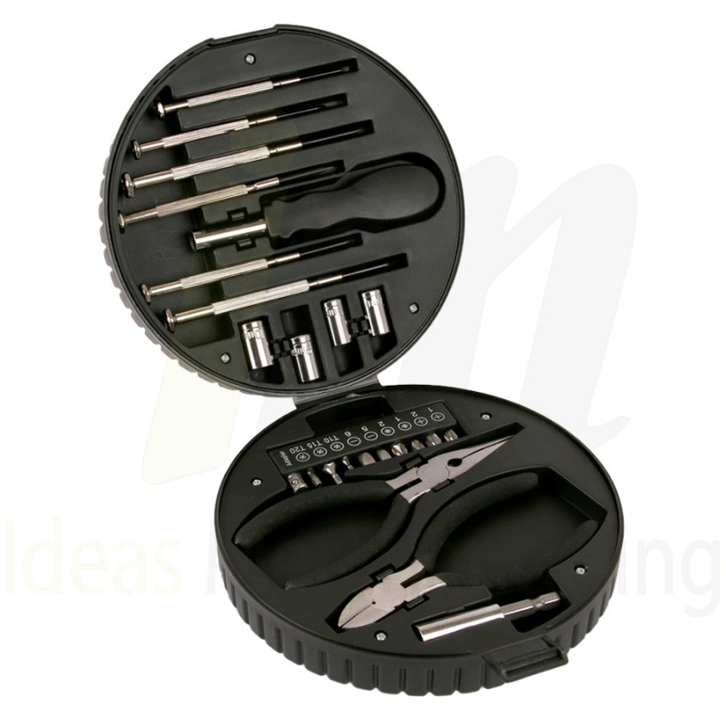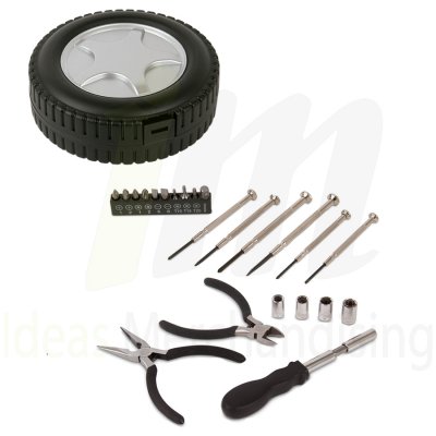 IM4239 Buscas regalos corporativos?. Venta de artículos corporativos en Lima. Set de Herramientas tipo llanta Medidas cerrado: 16.0 x 16.0 x 5.0cm. Medidas abierto 32.0 x 16.0cm. (24 piezas.) Cajita negra. Herramientas: 1 Alicate,1 Mango de desarmador, 1 Vástago o caña de desarmador, Puntas adaptadores para desarmador (10 und), Dados hexagonales para desarmador (5 und),Llave Allen para desarmador (3 tamaños),2 desarmadores delgados 1 punta estrella y 1 punta plana.